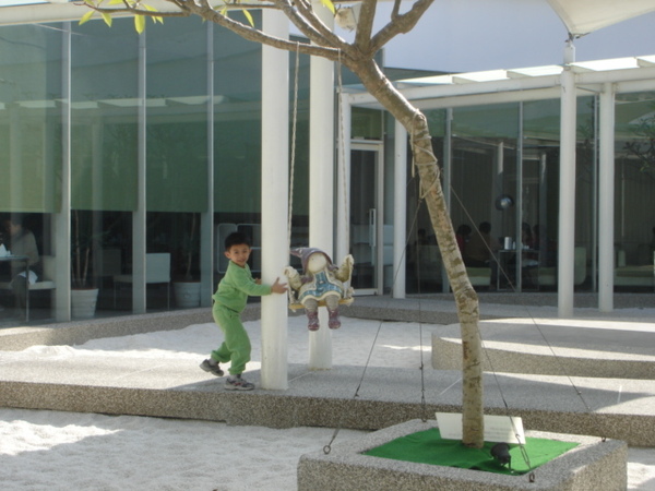 隔壁桌的小綠綠弟,有個年輕的辣媽當媽,推著人偶的鞦韆,意外望向鏡頭,笑了一下。